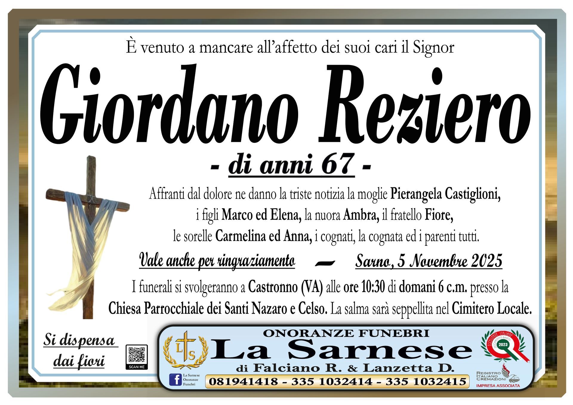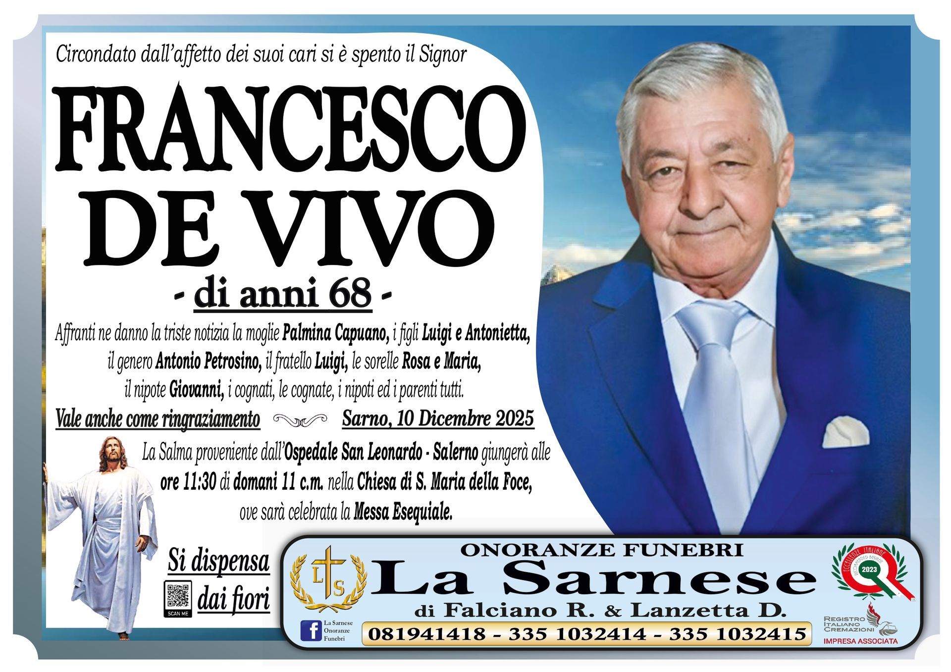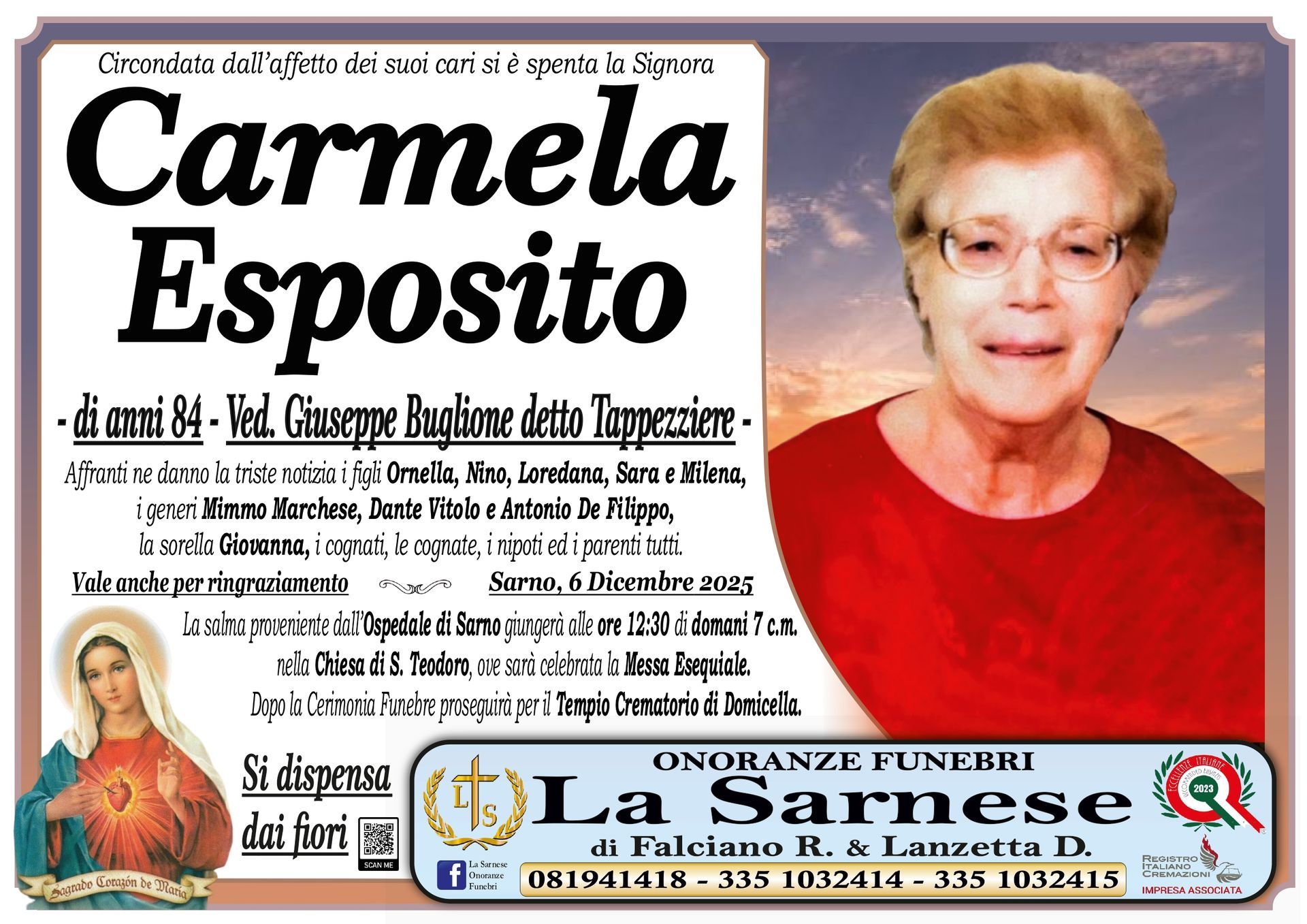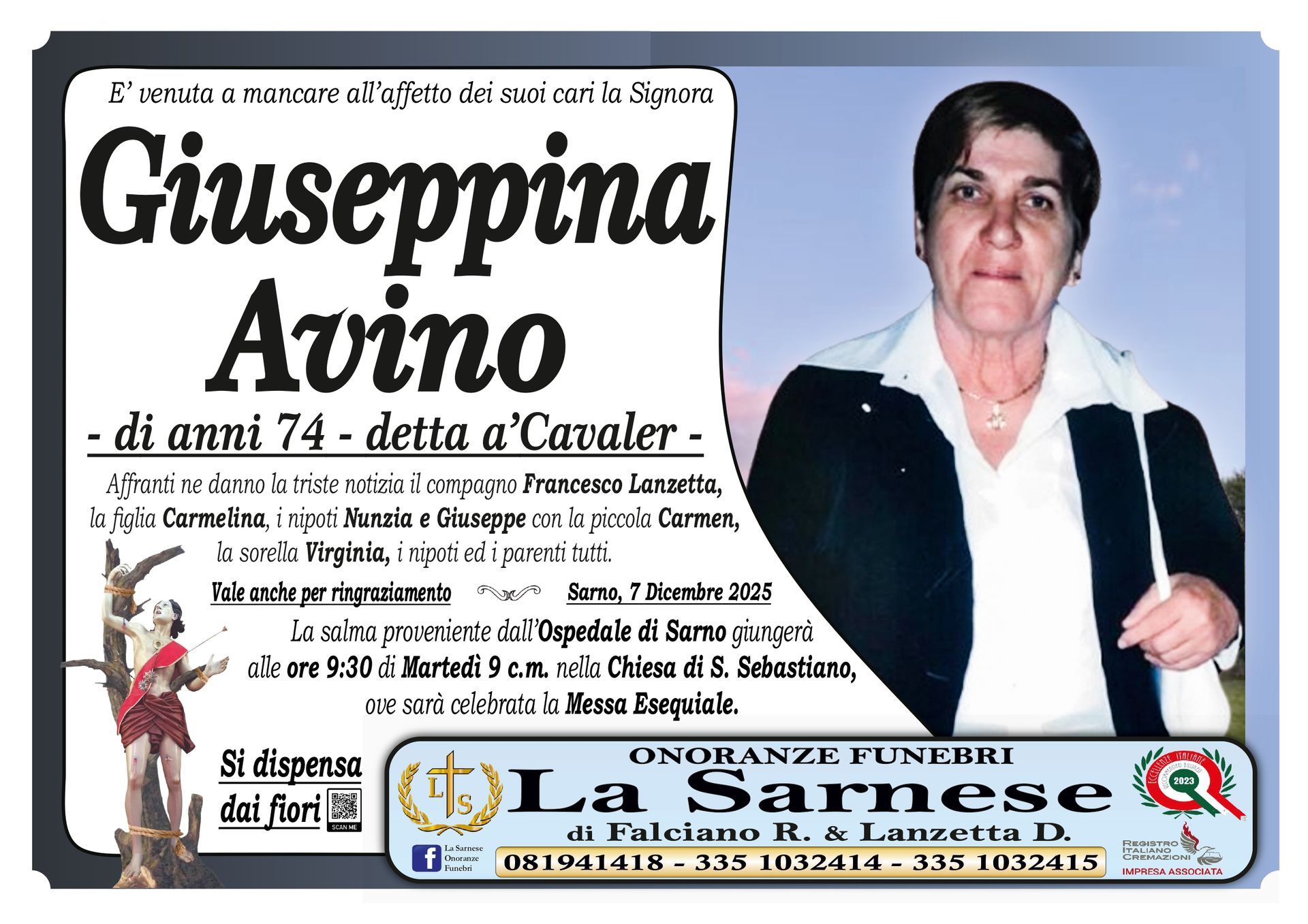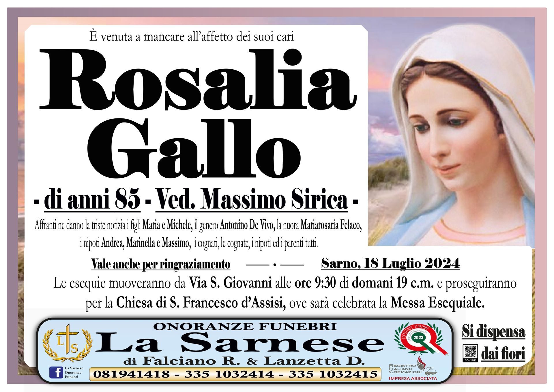 Onoranze Funebri La Sarnese si occuperà di recapitare il vostro messaggio alla famiglia del defunto.