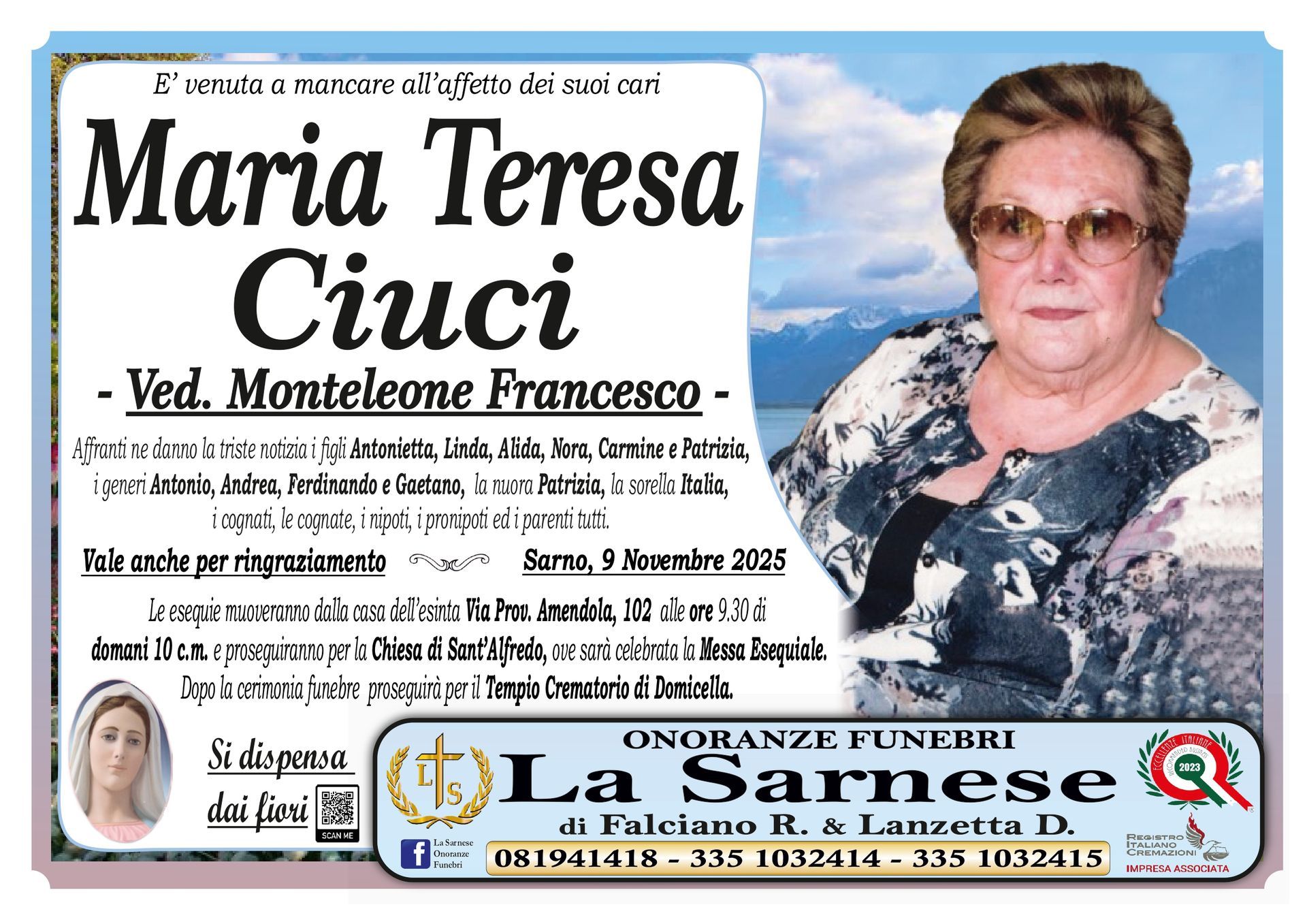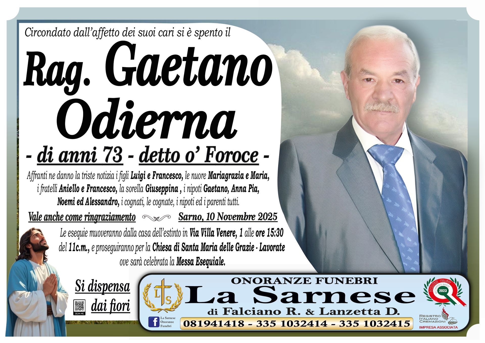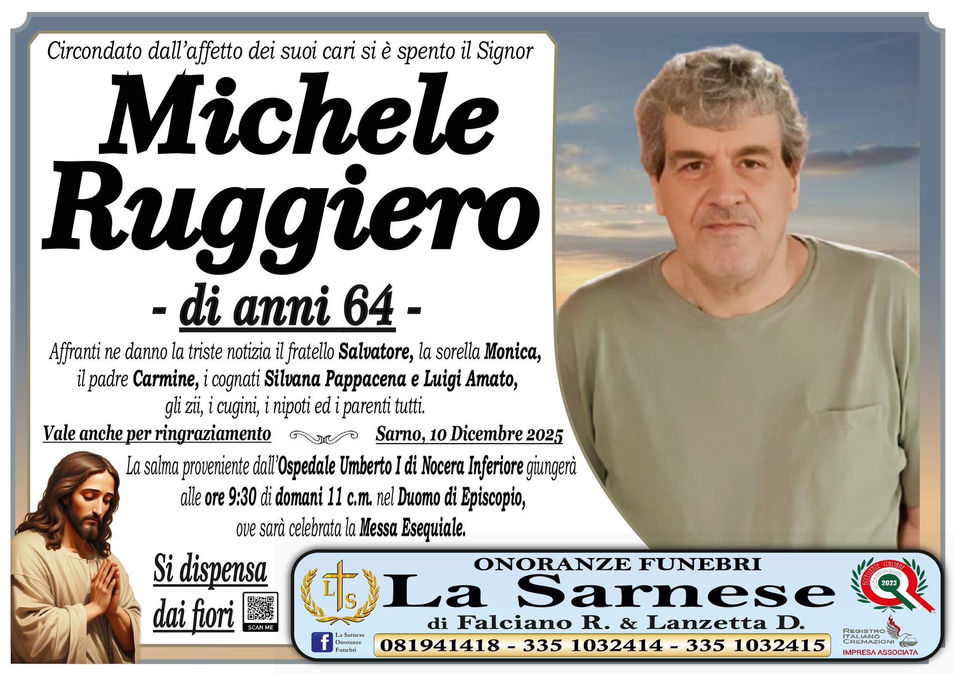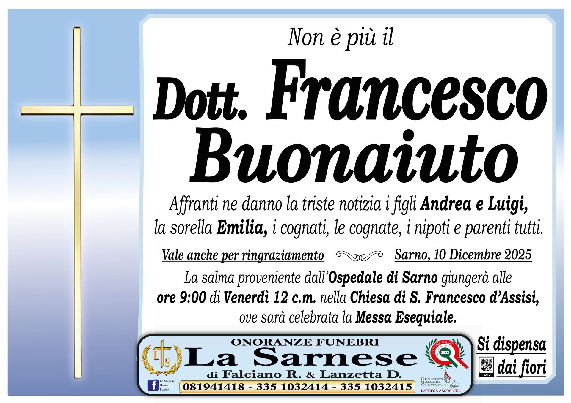 Onoranze Funebri La Sarnese si occuperà di recapitare il vostro messaggio alla famiglia del defunto.