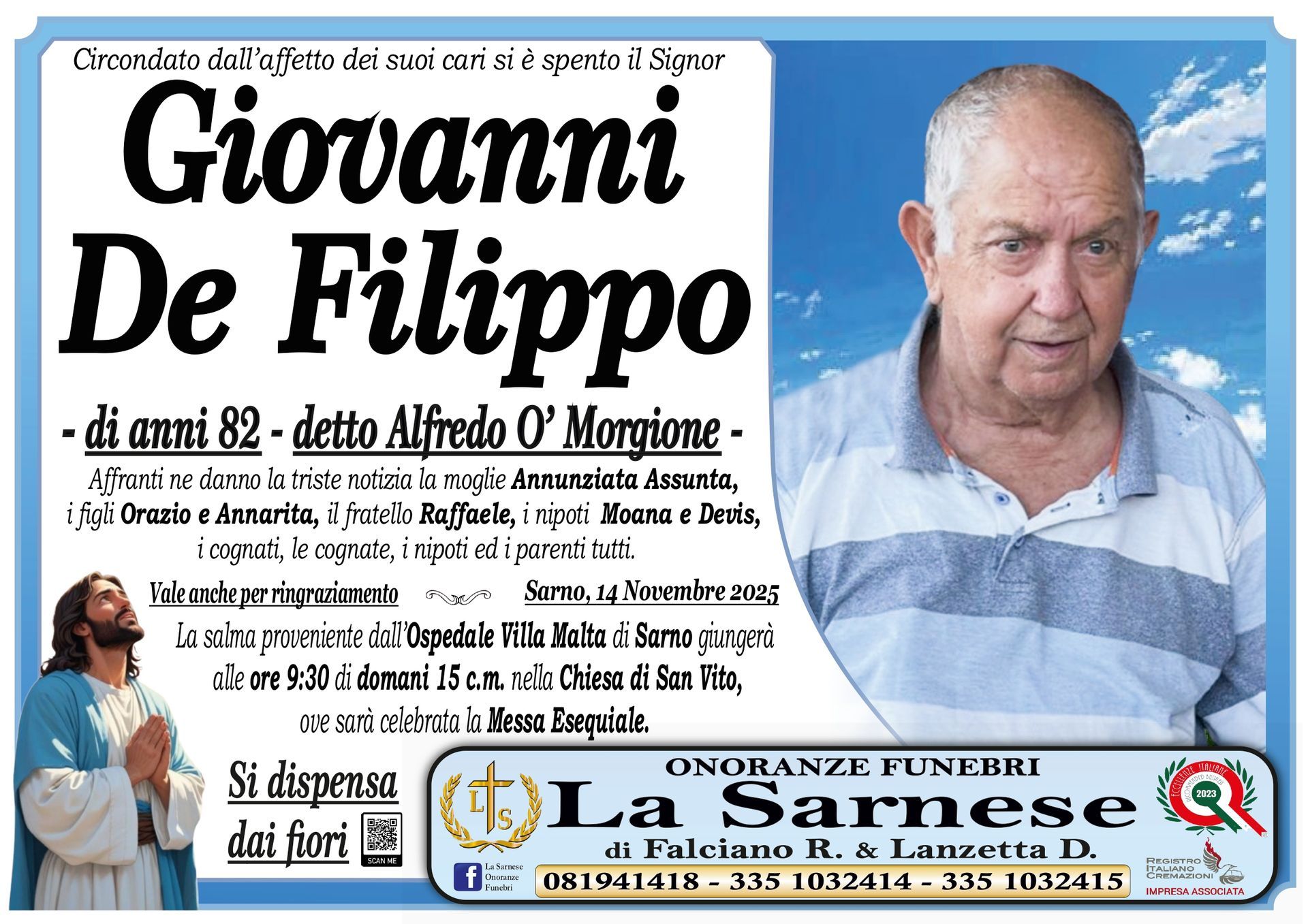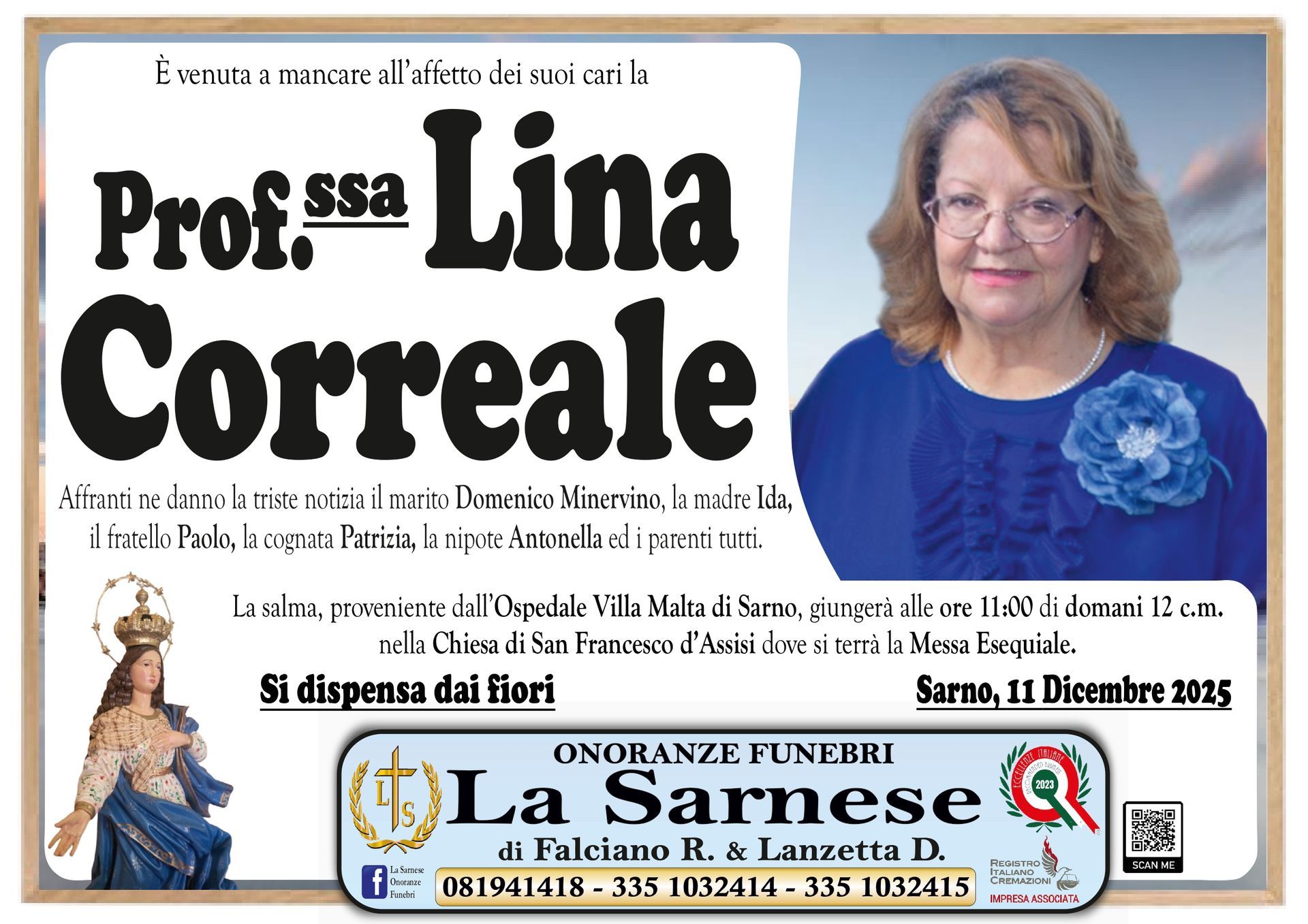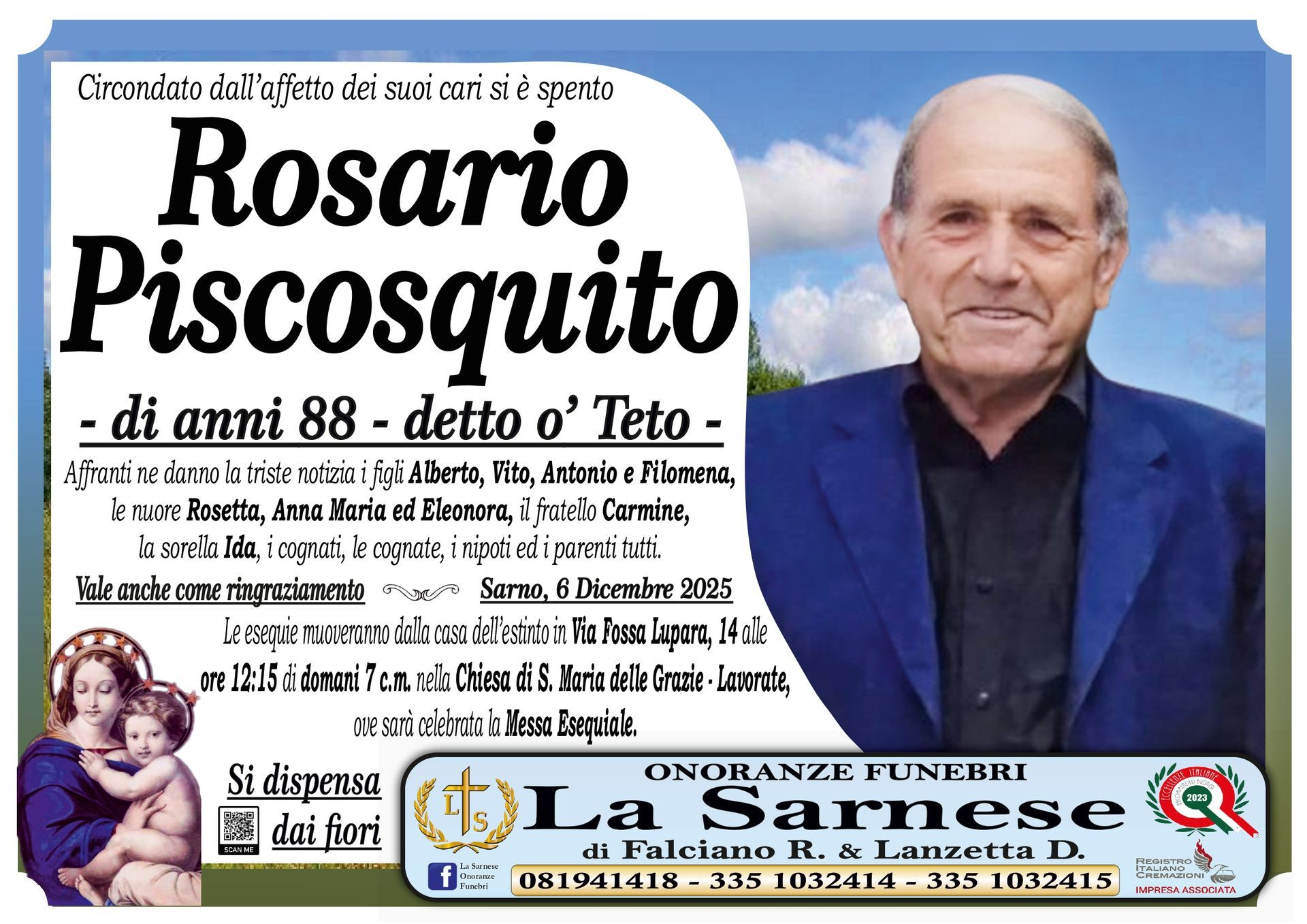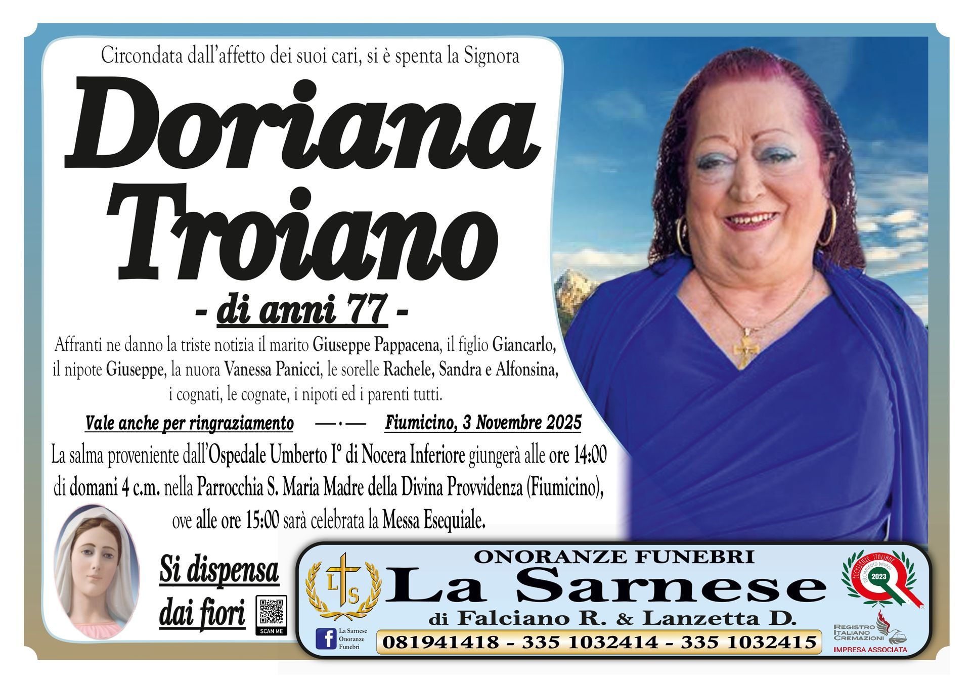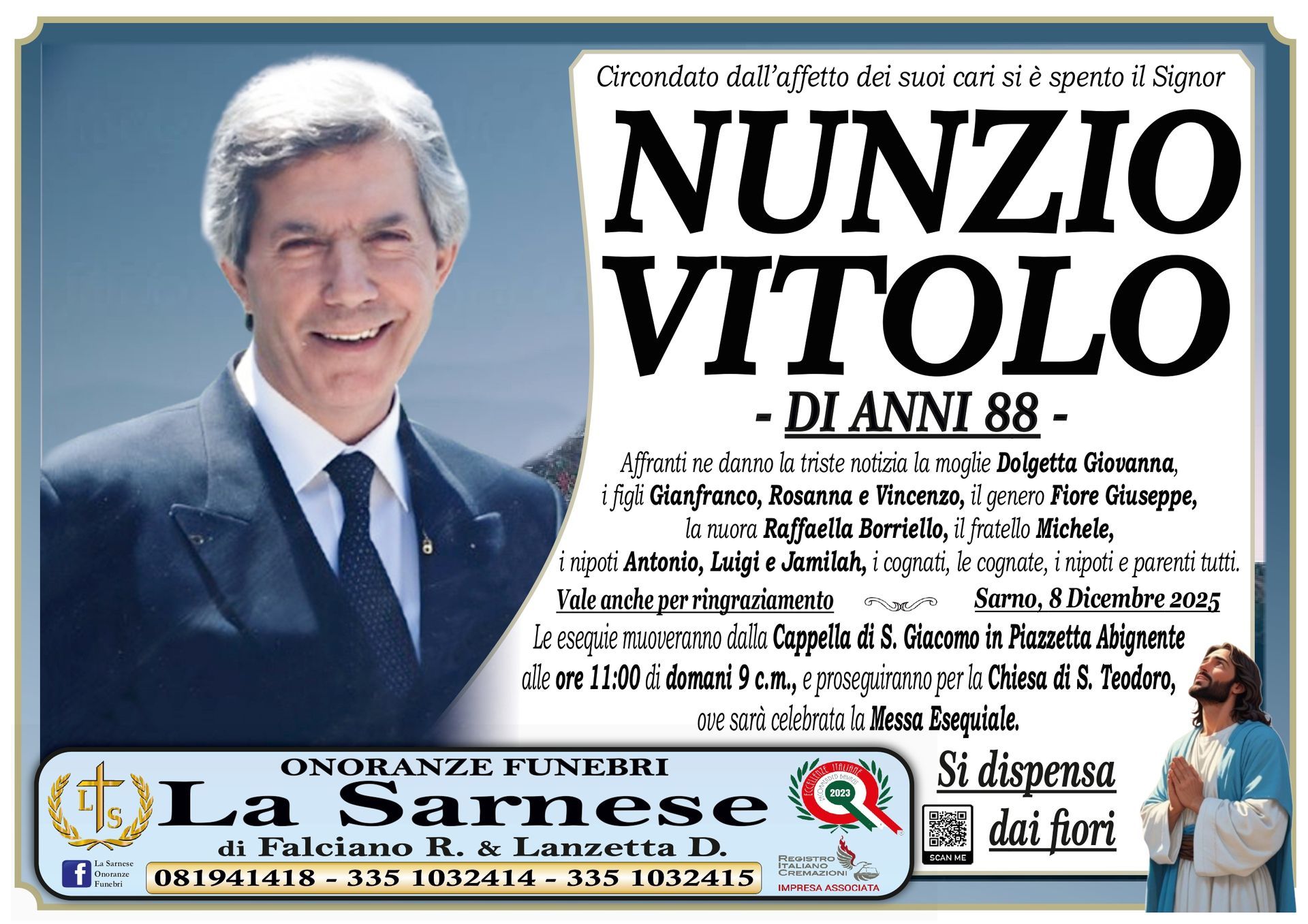 Onoranze Funebri La Sarnese si occuperà di recapitare il vostro messaggio alla famiglia del defunto.