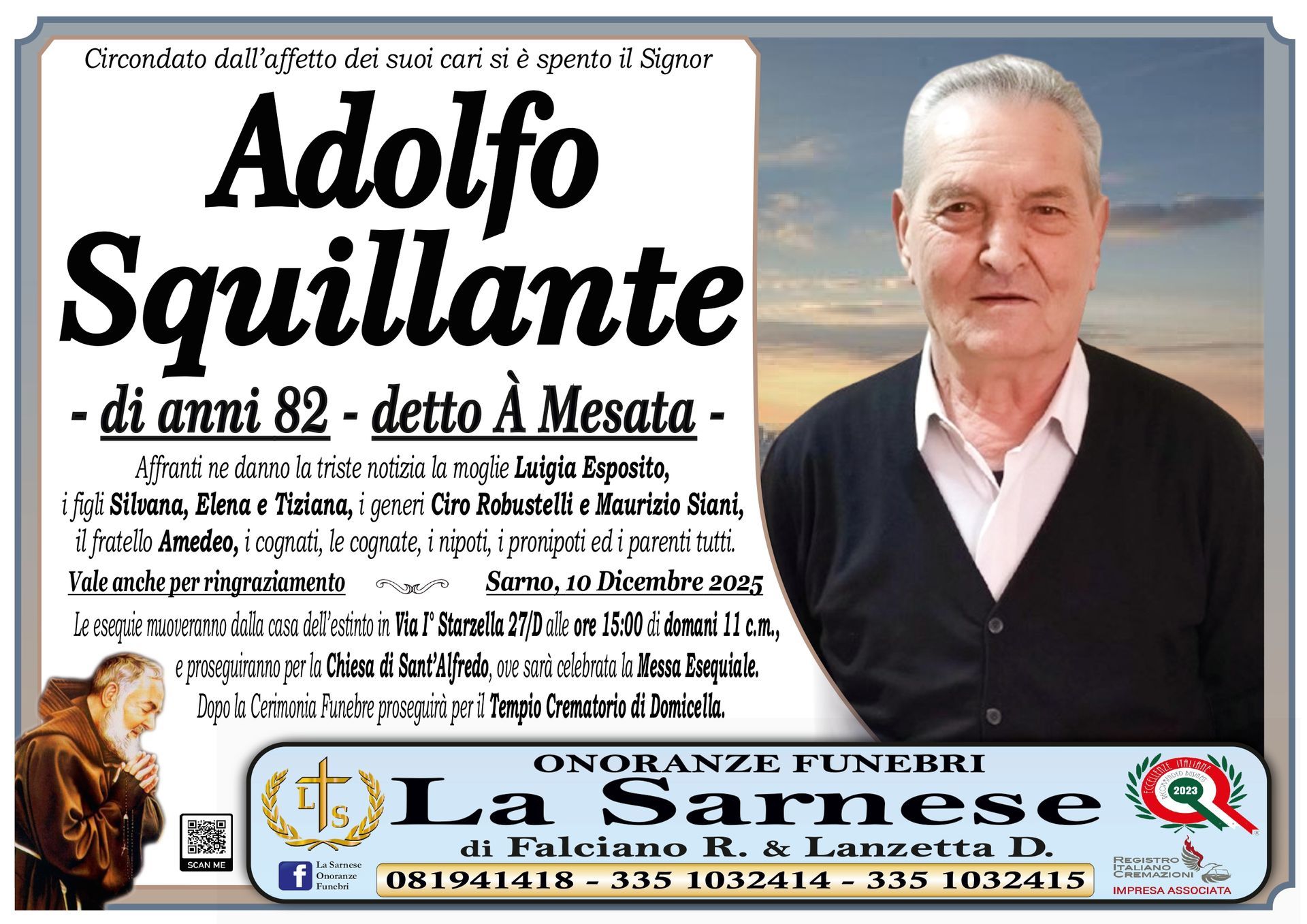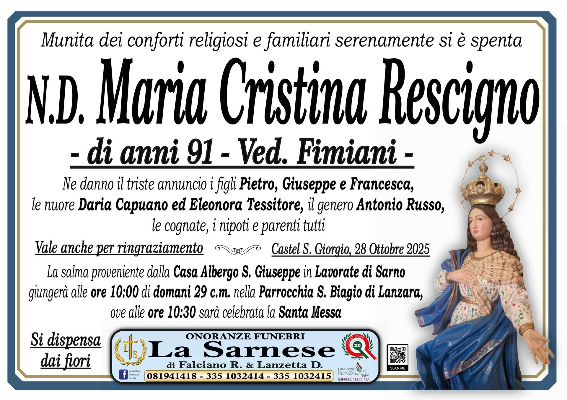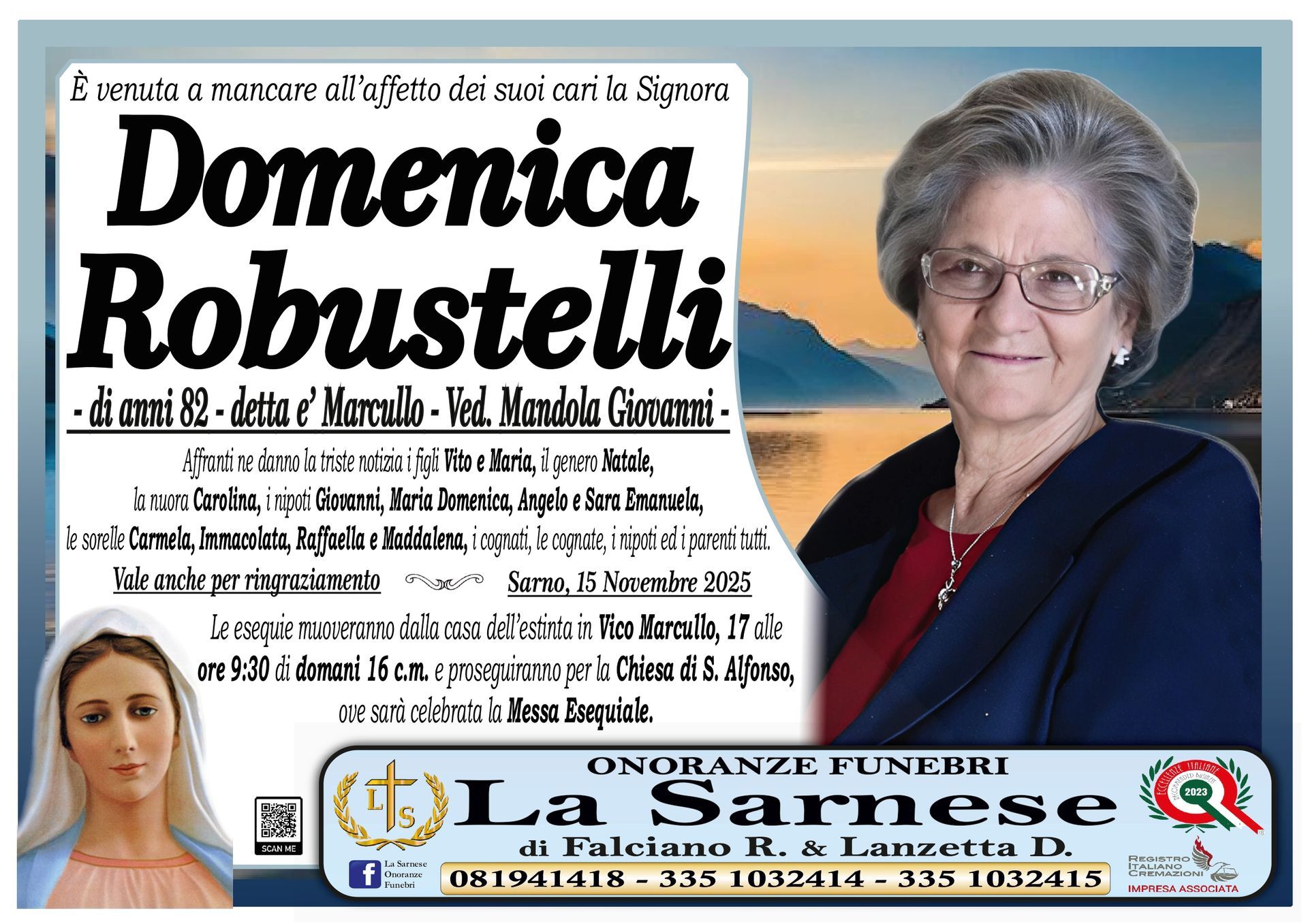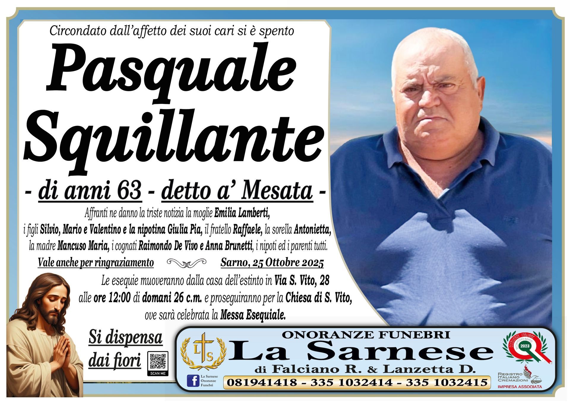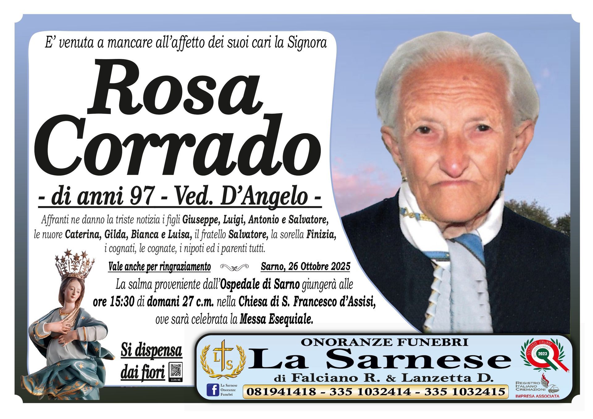 Onoranze Funebri La Sarnese si occuperà di recapitare il vostro messaggio alla famiglia del defunto.