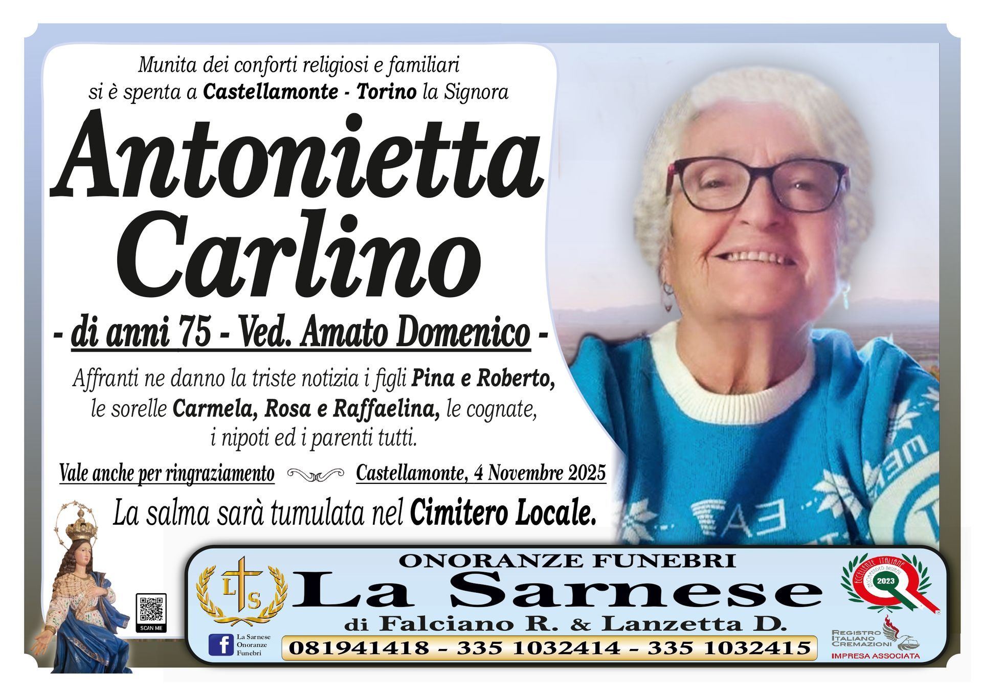 Questo spazio web è dedicato alla pubblicazione e consultazione degli annunci funebri dei vostri defunti e offre la possibilità, a chiunque lo desideri, di lasciare alla famiglia un messaggio di condoglianze o un pensiero in memoria della persona cara.